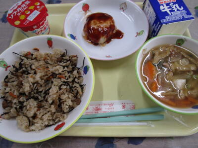 牛乳 ひじきご飯 チーズハンバーグ けんちん汁 ヨーグルト