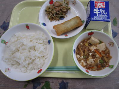 牛乳 ご飯 五目豆腐 ひじき入り春巻き ごま酢和え