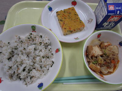 牛乳 わかめご飯 玉子の千草焼き 生揚げとこんにゃくのピリ辛炒め