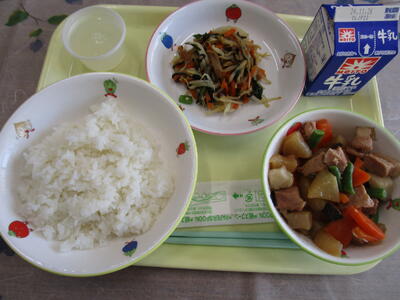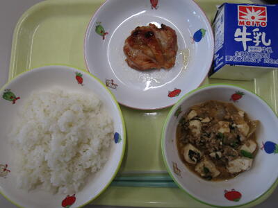 ごはん チキンの照り焼き 豚肉と豆腐のごまみそ炒め 牛乳