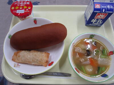 牛乳 黒糖パン ポトフ 豆とツナのパイ風春巻き ヨーグルト