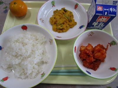 牛乳 ご飯 たらとじゃがいものチリソース カボチャサラダ みかん