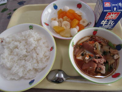 牛乳 ご飯 すき焼き風煮 フルーツ白玉
