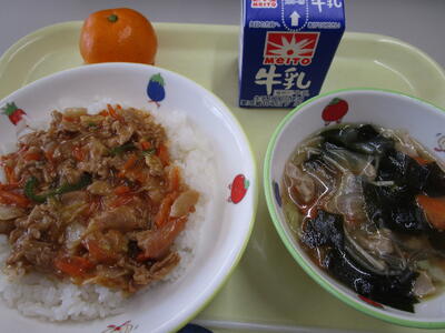 麦ごはん ホイコーロー丼 わかめスープ みかん 牛乳