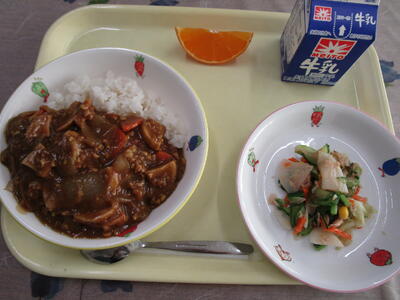 牛乳 麦ご飯 冬野菜カレー カブのサラダ ゆめマドンナ