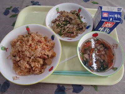 牛乳 キムタクご飯 豚肉の生姜炒め 春雨スープ