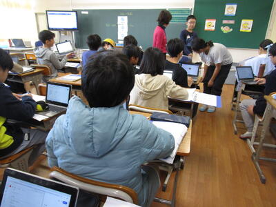 6年生、英語の学習で、森や生き物などの環境を守るために、自分たちにどんなことができるか、調べたり話し合ったりしています。「外来種をふやさないように、自分のペットをはなさない」や「森を守るために、紙を節約する」など様々な考えをもっていました。