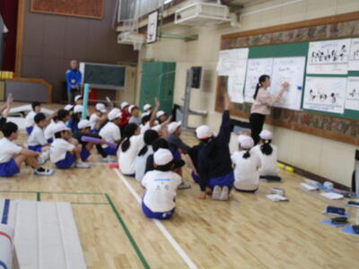 5年生、体育で台上前転の学習をしています。「大きな台上前転」のポイントを見つけて、工夫をしながら練習をしていました。
