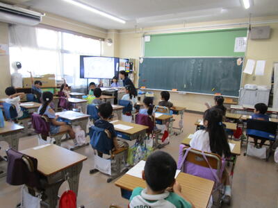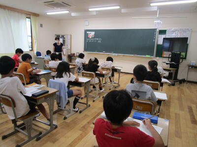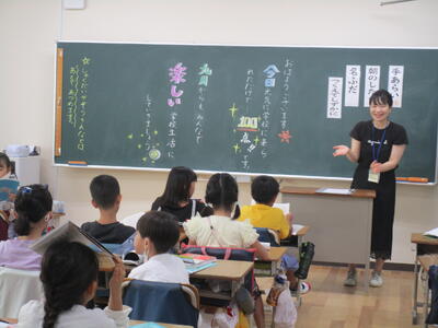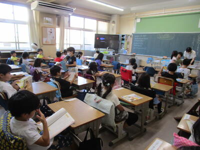 今日は朝からあいにくの雨模様でしたが、気温が下がり、熱中症の心配も減り、体も楽に過ごせました。1年生は、国語の「なつのおもいでをはなそう」で、夏休みの出来事を話す学習に取り組んでいました。姿勢もよく、しっかり挨拶ができました。