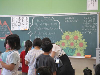 教室では、宿題集めや教科書配りなど、今日やらなければならないことが多くありました。子供たちも、教科書やドリルを運ぶなど、協力して過ごしている様子が、随所から伝わってきました。黒板には、「今日元気に登校できたら100点」や「みんなでまた力を合わせて頑張りましょう」など、担任の先生からのメッセージが書かれていました。転校生のいるクラスでは、簡単な自己紹介をしているクラスもありました。子供たちは、夏休み中に体も大きくなり、一回り大きくたくましくなったように感じました。これからの学校生活での成長・活躍が楽しみです。