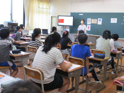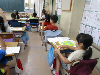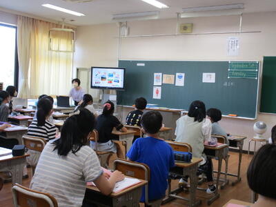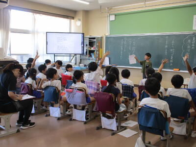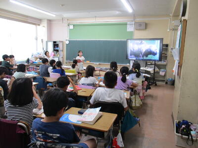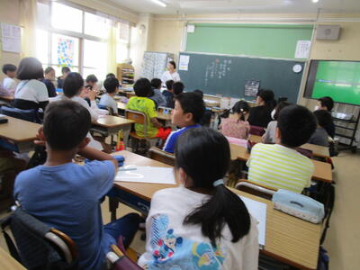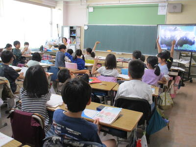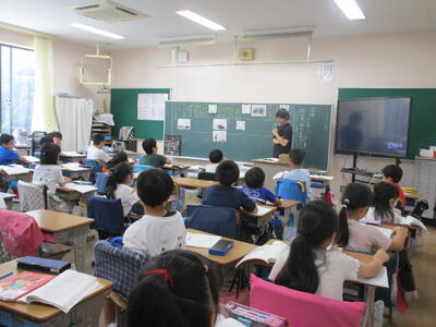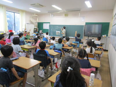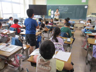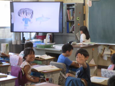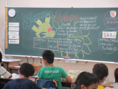 1年生は、書いてきた絵日記をもとに、絵を大きな画像にうつし、日記の文を読み発表していました。2年生は、書いた文を皆の前で発表していました。4年生は、聞いている子どもたちが記者になって、話し手に質問をして、話し手がそれにこたえる形で発表をしていました。6年生は、英語で夏休みの出来事を発表する準備を始めていました。学年の発達段階に応じて、様々な方法で、夏休みのことを伝え合っています。「市川の花火大会を見に行ったら、きれいだった。音がものすごく大きかった」「プールに行ったら、浮き輪から落ちてしまい大変だった」「キャンプに行って、外で食べたご飯がおいしかった」「海でイルカや亀と泳いで楽しかった」・・・。子供たちの発表からは、楽しかった夏休みの様子が伝わってきました。