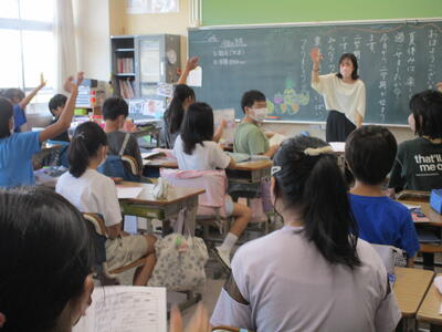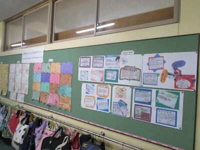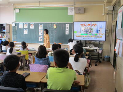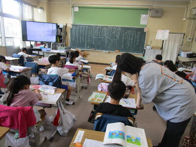 2年の教室では、町探検の話をしたり、絵本の読み聞かせをしたりしていました。絵本の読み聞かせは「くまたのびっくりだいさくせん」で、くまの子供がお母さんぐまをびっくりさせようといろいろなことをするお話です。「えー、うそ?!」「こんなことやったら、お母さん、怒るんじゃない」という読んでいる途中の子供の反応がとても楽しかったです。