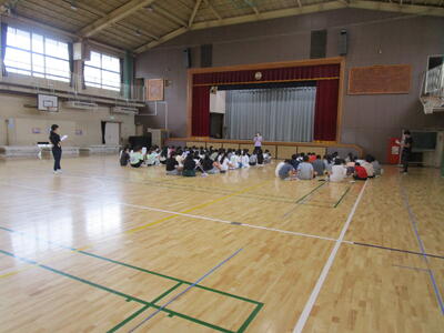 5年生、体育館体育です。鬼ごっこをしたり、二つのグループに分かれて長繩をしたりしていました。長縄の時は、持ち手を決めるのに相談してじゃんけんをしたり、縄が引っかかる子にアドバイスをしたり、自分たちで考えて行動する場面がたくさんありました。