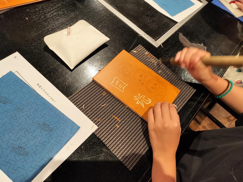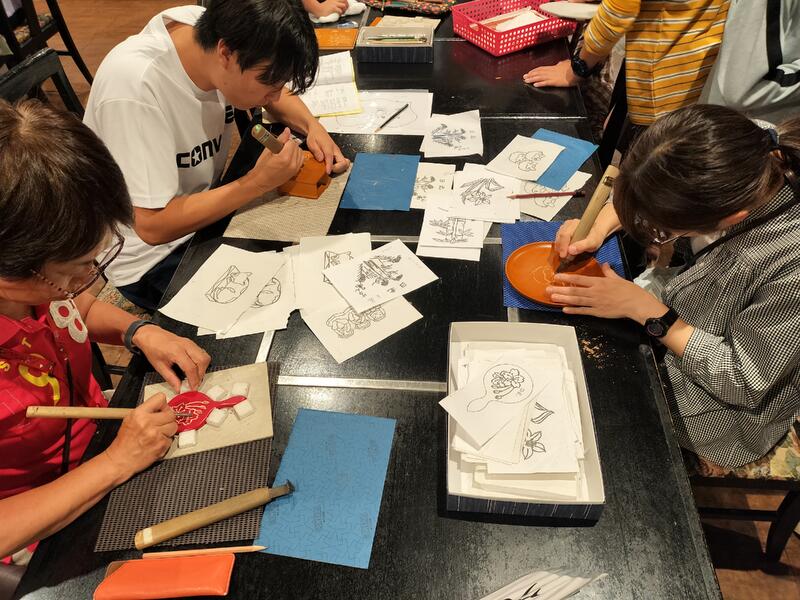 本日最後のプログラムは日光彫です。ひっかき刀という珍しい彫刻刀を使って作品を作ります。