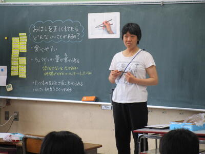 2年生、栄養教諭の先生が「はしのもちかた」について、子供たちに話をしていました。正しい箸の持ち方を確認したり、箸を正しく使うとどんないいことがあるのか、考えたりしました。