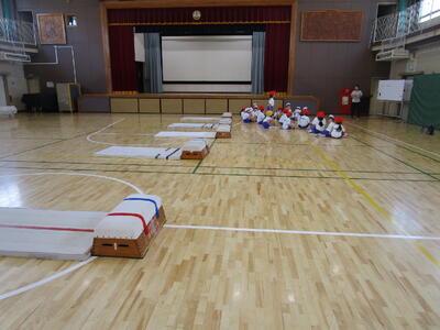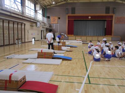1年生、体育館で、マットや跳び箱をつかい、跳び箱の上から着地の練習をしていました。先生が着地の仕方のお手本をみせると、子供たちからは「かっこいい!」というつぶやきがあり、かっこいい着地について、皆で考えました。子供たちから「足は揃えて、床につく」「ひざは曲げる」「足は少し開いたほうが簡単だ」などの意見がでました。その後、練習に励んでいました。
