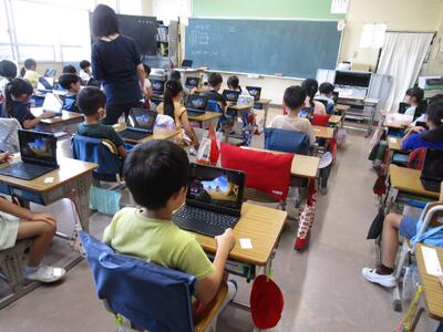 1年生、自分のタブレットを初めて開きました。これから何をするのか、どきどきわくわく。電源ボタンを自分で押して、画面がつくと「わーついた!」と喜んでいました。喜ぶ子供たちの顔を見ていると、こちらまでうれしくなります。子供たちが困ったときに対応できるように、担任の先生だけでなく、ICT支援員さんや、手伝いの先生方も、学習に参加していました。