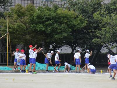1年生、生活科で「水を使った遊び」をしていました。ペットボトルを家から持ってきて、タオルを首に巻いてやる気満々です。鉄棒に的をつけて的当てをしたり、水かけおにごっこをしたり、子供たち楽しんでいました。