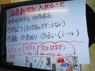 5年生、おすすめの本を決めて、ミニ新聞にまとめています。紙面が限られているので、題名やイラストをどう工夫するか考えています。先生からも、「こんな工夫の仕方があるよ」とお手本を提示していました。