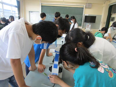 6年生、理科室で「植物のつくりと働き」の学習で、育てたホウセンカの葉の気孔を観察していました。葉をちぎり、葉の裏の薄皮が出てきたら、その薄皮を顕微鏡で観察します。葉の裏の薄皮をとるのがとても大変で、気孔がよく見えると、喜びの声があがっていました。