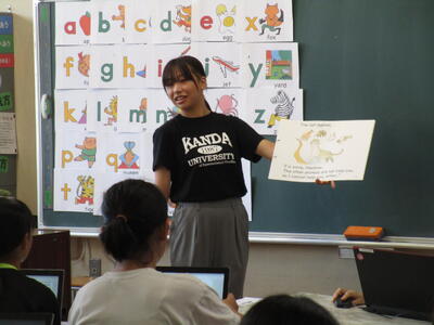 2年生、今日は中学校のALTの先生が各クラス1時間ずつ、教室に入って、英語で授業をしています。自己紹介を画像とともにわかりやすくしているので、子供たちも張り切って活動していました。6年生は、神田外語大学の学生さんが英語の本の読み聞かせをした後に、意味や発音の練習をしていました。日頃から、英語の学習に取り組んでいるので、とても、スムースに授業が進んでいました。