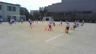 「体つくり運動」の学習として、コーンやミニハードル、ケンステップを使った障害走です。