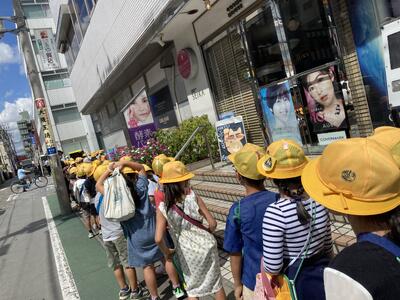 2年生が生活科の学習の一環で学区探検に行きました。大和田の街には、どんなお店や建物があるのか、自分たちの目で確かめます。今日は、日差しが強く暑かったため、途中、2箇所の公園で休憩をしました。