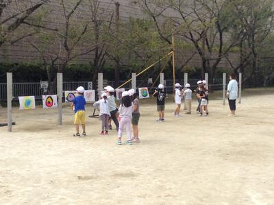 朝は気温が高くなく実施できるか心配でしたが、少しずつ気温が上がり、「ほかの人に水をかけない」という約束を守って、的あてゲームや水を使ったお絵かきを楽しみました。