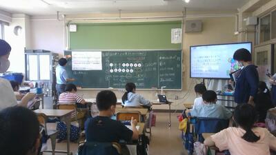 若年層の先生だけでなく、たくさんの先生が5年1組の授業を参観しました。子ども達は文章問題を読み、答えを導き出すために情報を整理し、どのような考え方ができるか意見を出し合っていました。