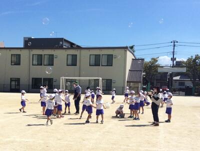 気持ちのよい日ざしの中、1年生が校庭でシャボン玉遊びを楽しみました。