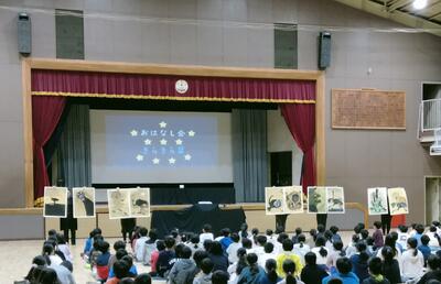今日は2時間目に体育館で、読み聞かせサークル「きらきら星」さんによるおはなし会が開催されました。