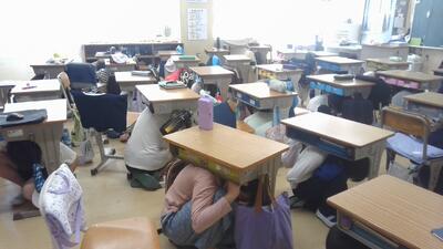 訓練放送が流れると、子ども達はすばやく机の下にもぐり、身の安全を確保しました。こちらは6年生の一次避難の様子です。