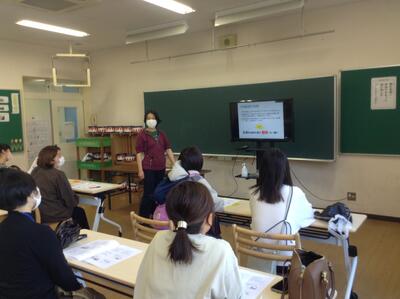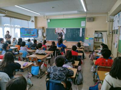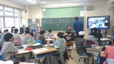 はじめに、栄養教諭が給食についての説明や紹介をしたところ、特に反応があったのは、「給食室の1日」についてです。1回に大量の食材を使用し、大きな調理器具で作っていることを映像を交えて紹介した時には、驚きの声があがっていました。