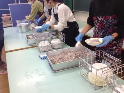 その後、サポーターの方が配膳をし、参加された皆さんで、給食の試食を行いました。メニューは、「ゆかりごはん・ギンダラの西京焼き・あげじゃが入りきんぴら・ミニトマト・牛乳」です。試食後の感想では、安全に作られていることへの感謝の言葉や「子どもがおいしいと言っている給食を食べられてよかった」などの言葉がありました。サポーターの方々からも「皆さんに喜んでもらい、やってよかった」という声をいただきました。