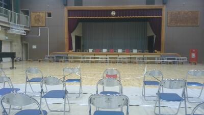 今年度は、ステージやひな壇、ポートボール台などを利用して高低差をつけて児童の立ち位置を設定しました。お子様の立ち位置は、各学年の学年だより臨時号をご確認ください。