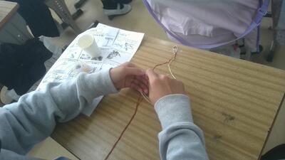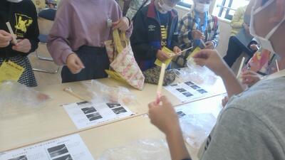 ②特別教室では、クラスごとに射的を楽しみました。まずは、洗濯ばさみと輪ゴムと割りばしを使って割り箸鉄砲を作りました。