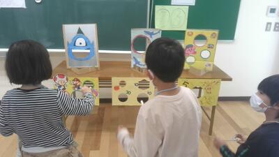 お手製の割りばし鉄砲で射的に挑戦します。手作りの的は人気のあるキャラクターが描かれていて、「やった!入った!」「おしい!」と、夢中になっていました。