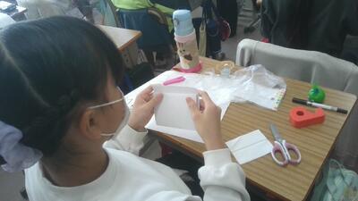 ①教室では、担当の保護者の方々に教えていただきながら、工作をしました。