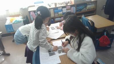 1年2組では、少人数グループで、司会の進行のもと、それぞれの考えを交流しました。友達の考えで参考になるものは、自分のプリントに書き足しているところから、伝えるだけでなく、相手の話をしっかりと聞こうとする姿勢が感じられました。