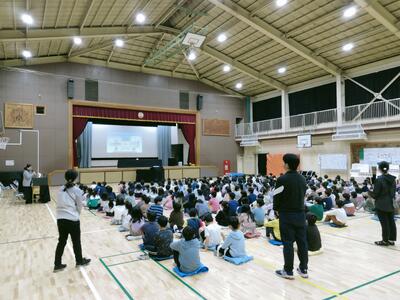 体育館が真っ暗になると、前回の3,4年生の時以上に歓声が起こりました。その後も子ども達は、曲に合わせて手拍子をしたり、歌を口ずさんだりして、お話の世界に引き込まれていきました。また、喜んだり、驚いたり、安心したりするなど低学年らしい反応があり、「きらきら星」さんと子ども達が交流しあうような素敵な時間が流れていきました。