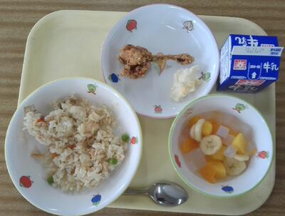 献立の内容は、牛乳、ツナピラフ、フライドチキン、じゃがいものサラダ、フルーツポンチです。どれも大和田っ子には人気の給食です。