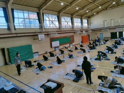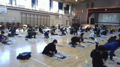3~6年生は、12月に一回、そして1月に一回と、外部講師の先生をお招きして書き初めの学習を行っています。昨日は3,4年生が、今日は5、6年生が体育館で指導を受けました。