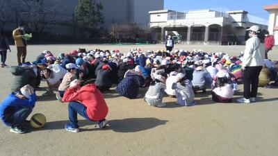 今日は業間休みが始まって5分後に訓練放送が鳴りました。天気が良かったので、校庭で遊んでいる子ども達がたくさんいましたが、放送に気が付くと、駆け足で校庭の中心に集まり、頭を守る姿勢をとっていました。