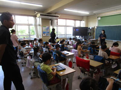 1年生、自分のタブレットを初めて開きました。これから何をするのか、どきどきわくわく。電源ボタンを自分で押して、画面がつくと「わーついた!」と喜んでいました。喜ぶ子供たちの顔を見ていると、こちらまでうれしくなります。子供たちが困ったときに対応できるように、担任の先生だけでなく、ICT支援員さんや、手伝いの先生方も、学習に参加していました。