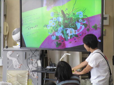 2年の教室では、町探検の話をしたり、絵本の読み聞かせをしたりしていました。絵本の読み聞かせは「くまたのびっくりだいさくせん」で、くまの子供がお母さんぐまをびっくりさせようといろいろなことをするお話です。「えー、うそ?!」「こんなことやったら、お母さん、怒るんじゃない」という読んでいる途中の子供の反応がとても楽しかったです。