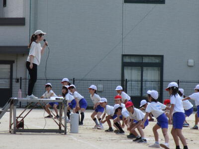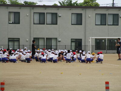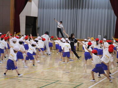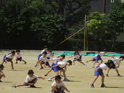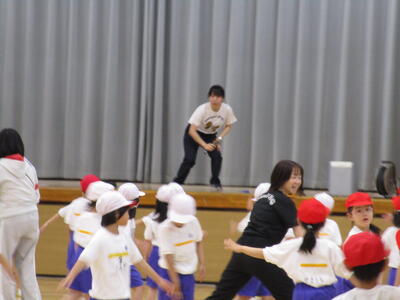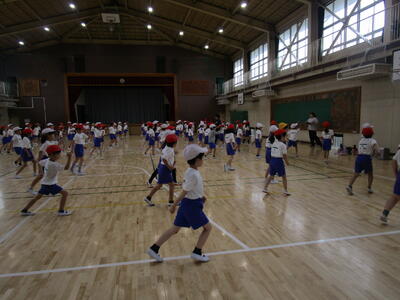 1年生、体育館で学年合同で運動会の踊りの練習をしていました。説明を聞いて、先生が躍るのに合わせて、少しずつ踊っていました。「ちょっとむずかしいけど、うまく踊れていますね」と先生が声をかけると、ますます張り切って子供たちが躍っていました。