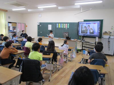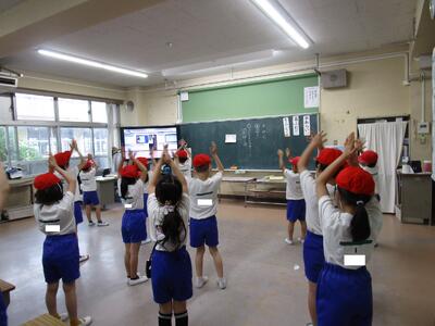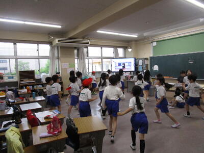 2年生、先生が録画した運動会の踊りの練習を教室で見ています。子供たちも、録画された踊りを見ながら、「こんなふうに踊るといいね」「○○さんの踊りがかっこいい」など言って、練習をしていました。