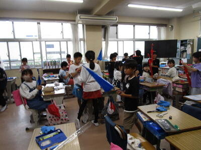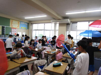 4年生、運動会で傘を使って表現運動をするようで、教室で、自分の傘がわかるように、名前をつけていました。とてもうれしそうに、子供たちは傘を広げたり、回したりしていました。