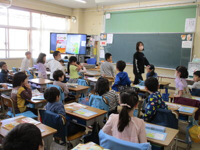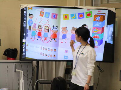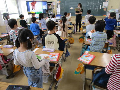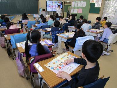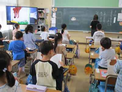 1年生、算数で「なんばんめ」の学習をしていました。大きな画面に教科書と同じ画像を映して、左から3番目を確認していました。子供たちが見ているものと同じなので、とてもわかりやすいですね。隣のクラスでは「前から1番目の人、立ちましょう」と先生が呼びかけると、子供たちがさっと立っていました。学んだことを生活の場面に生かすのも大切ですね。
