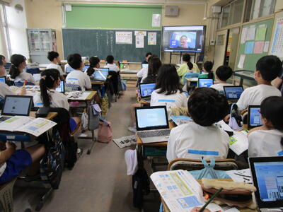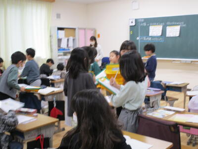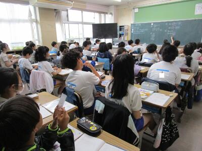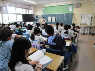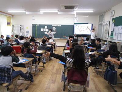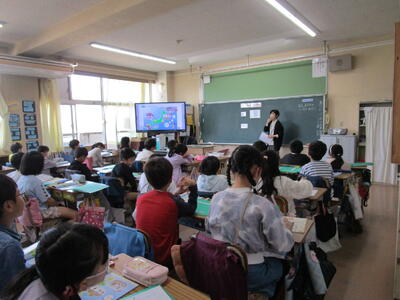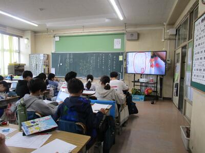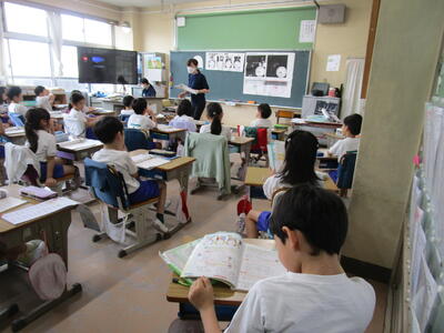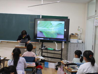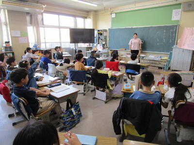 3年生、3組で4組の先生が社会を、4組では3組の先生が理科を教えていました。今年度、3年生も教科担任制を始めました。4組では、実際に育てているモンシロチョウの幼虫が、キャベツの葉を食べたり、糞をしたりしているところが、前の大きな画面に映し出され、皆で共有していました。子供たちの反応もとてもよかったです。